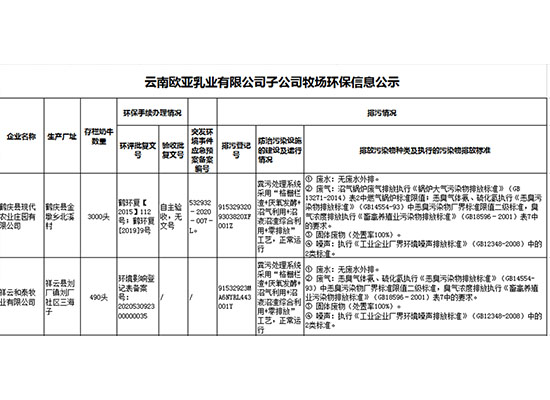 云南歐亞乳業(yè)有限公司子公司牧場環(huán)保信息公示